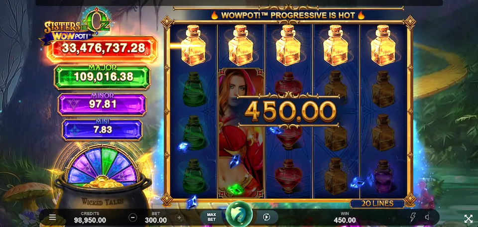 Sisters of Oz Wowpot is a progressive jackpot slot based on the Wizard of OZ stories by Frank L. Baum. This game has five reels and 20 paylines, with jumbo symbols, free spins and multipliers. The game has enough magic to keep you entertained on a desktop or mobile device.